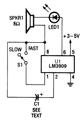 The LM3090 can also be used to drive both an LED and a speaker. In this circuit, each time that LED1 blinks, SPKR1 (an 8-Ω speaker) emits a sharp click sound. (View)