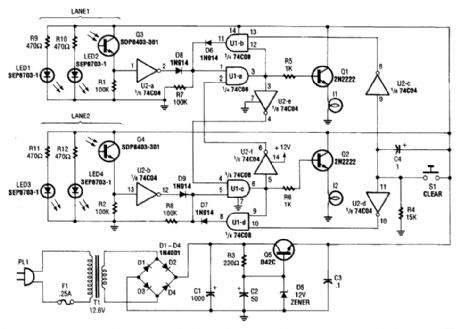 This derby-winner inc!icator uses infrared emitters and sensors to detect a car crossing the fintsh line. The first car to finish locks out the data from the second car, and the system can be reset by pressing S1. (View)