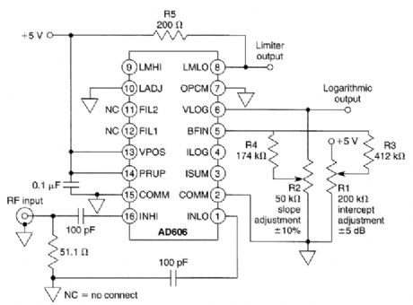 Using an AD606 log amplifier, this indicator gives a logarithmic output of +0.3 V at -80-dBm in-put to +3.5 V at 10-dBm input. Frequency range is to 50 MHz for this IC device. (View)