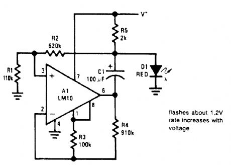 When operating with a single cell,it is necessary to incorporate switching circuitry to developsufficient voltage to drive the LED,A circuit that accomplishes this IS drawn In the figure shown Basically, it IS a voltage-cqntrolled asymmetrical multivibrator with a minimum operating thresholdgtven by∶ Above this threshold,the flash frequency increases with voltage This is a far more noticeable indication of a deteriorating battery than merely dimming the LED In addition,the indicator can bemade visible with considerably less power drain With the values shown,the flash rate is 1.4 sec -1at 1.2V with 300-μA drain and 5.5 sec-1 at 1.55V with 800-μA drain Equivalent visibility for continuous operation would require more than 5-mA drain. (View)