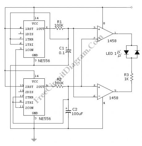 This circuit gives a changing-color LED display, where a LED will emit a dynamic shifting color, from red to green smoothly through yellow. The circuit uses NE556 dual timer, equal to two 555 IC but in only one package. The oscillators is set at different frequencies. The high frequency (upper part) is used to construct a PWM signal, and the lower frequency oscillator is used to control the shifting frequency. What is done by the low frequency oscillator is no more than modulating the duty cycle (active factor) of the PWM.