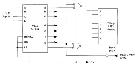 This circuit shows how a 7448 IC is used to drive a 7-segment LCD display. Atn external 50-Hz square wave supplies necessary phase signals to the back plane of the display. (View)