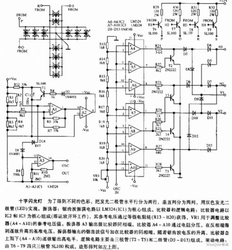 In order to get different colors, we divideLEDs into two lines horizontally and two lines vertically. And we use two kinds of colors of LED to make it come true. LM324(IC1) is the center of saw tooth oscillator circuit while IC2 and IC3 are the center of comparator, whose referring voltage is gotten through resistance series R13 to R20.And VR1 is used to adjust the referring voltage value of comparator A4 to A10. (View)