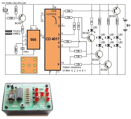 This circuit produces a random number from 1 to 6 on LEDs that are similar to the pips on the side of a dice. When the two TOUCH WIRES are touched with a finger, the LEDs flash very quickly and when the finger is removed, they gradually slow down and come to a stop.