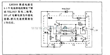 Withthe 1.5V battery supply power, The Integrated circuit LM3909 can drive the light emitting diode NSL5027. The 300uF electrolytic capacitor is circumscribed capacitor, which makes the flash speed limit around 1Hz. (View)