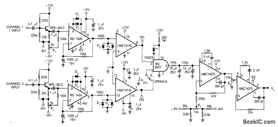 Provides better than 2% accuracy over most of frequency range, as required for making Bode plots. Based on squaring two sine waves and comparing amount of overlap to total period of an input wave. This gives directly the amount of phase difference between input wave trains, up to 180°. Instead of measuring periods, overlap is integrated over total period to give average of ON to OFF times that can be read as phase difference on voltmeter. Article gives erformancespecifications and describes circuit operation in detail.-D. Kesner, IC Phase Meter Beats High Costs, EDN|EEE Magazine, Oct. 15, 1971, p 49-52.