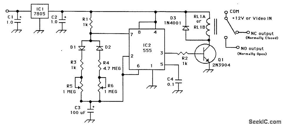Designed to automatically identify a transmitter every 10 minutes, this 555 circuit has adjustable charge and discharge paths. The IC should be a standard 555 type, not a CMOS type. C3 should be tanta-lum. The relay is a small 5-V reed type.