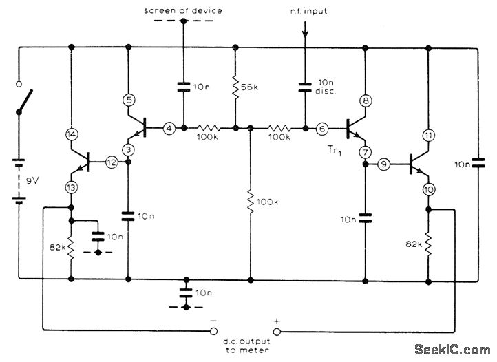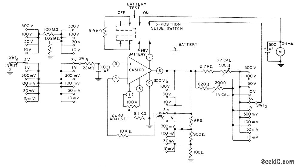 Rang switch is ganged between input and output circuits of CA3160 bipolar MOS opamp to permit selection of proper output voltage for feedback to terminal 2 of opamp through 10K current-limiting resistor. Circuit operates from single 8.4-V rnercury battery and draws about 500μA plus meter current;at input for full-scale reading, total supply current drain is about 1.5mA. –Circuit ldeas for PCA Liner ICs, RCA Solid State Division, Somerville, NJ, 1977, p 14.