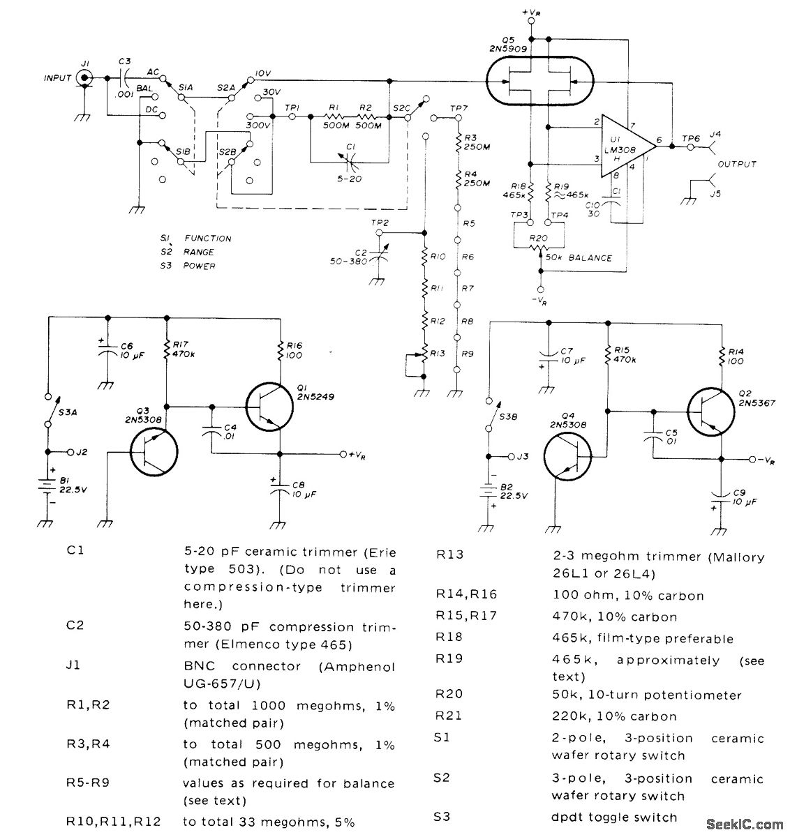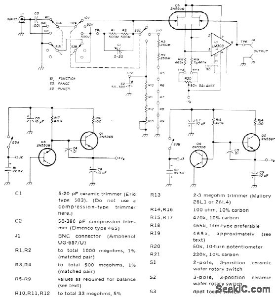High-accuracy meter-interface amplifier for AC and DC voltage measurements has input resistance of 1,000,000 megohms. Amplifier eliminates voltmeter errors due to loading by using special 2N5909 dual FET with exceptionally low gate leakage current. FET and opamp are connected as voltage follower with gain of 1. Accuracy on 0-10 V range is 0.1% or better. For higher voltage ranges, accuracy depends on that of resistive voltage divider used. Three ranges provided have full-scale values of 10, 30, and 300 V. AC RMS inputs are limited to 70% of DC ranges. Two voltage regulators are used with battery supply to permit use of batteries exceeding 18-V voltage rating of opamp, so battery voltages can drop considerably before replacement is required. Article covers construction and adjustment.-J. R. Laughlin, High-Impedance Meter Interface, Ham Radio, Jan. 1974, p 20-25.