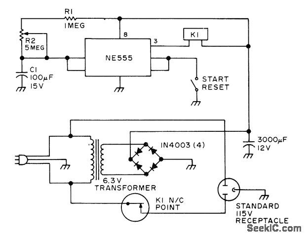 NE555 timer circuit turns off television set or other device at any desired time up to about 1 h after start switch is closed. Use IRC MR312C relay having coil resistance of 212 ohms, or other 12-V relay drawing less than 200 mA. With values shown, R2 gives time delay range of 3 to 58 min. For other ranges, change values of R2 and C1. Clockwise from top, pins on NE555 are 8,3, 4, 2, 1, 7, and 6.-P. C. Walton, Build This $5 Timer, 73 Magazine, Jan. 1976, p 129.