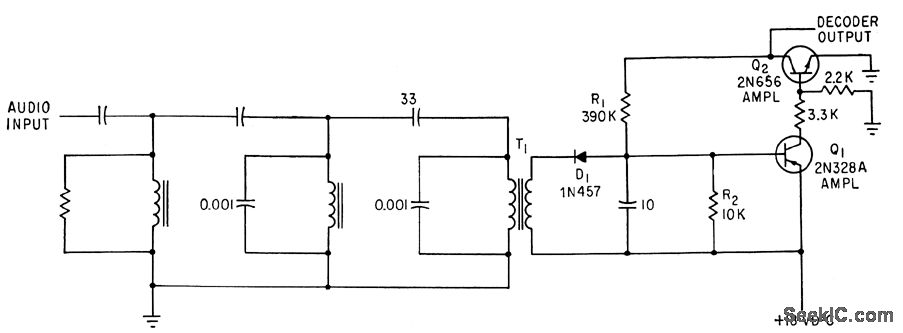 L-C filter in each decoder is tuned to channel tone,with 35-db adjacent-channel rejection.Rectified output of detector D1 drives two-stage d.c amplifier having relay load. Used in Mercury spacecraft command receiver.-R.Elliott,First Details on Mercury Spacecraft Command Receiver,Electronics,36:5,p32-35