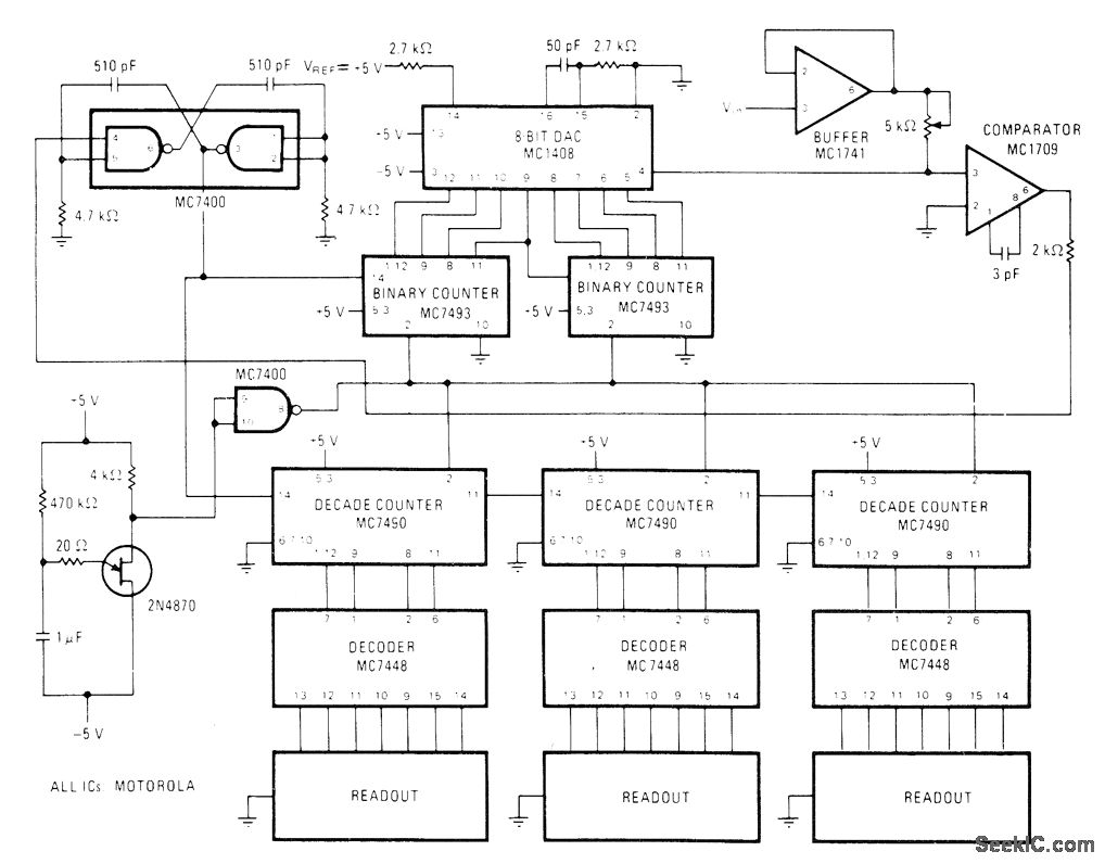 Closed-loop system designed around Motorola MC1408 8-bit D/A converter uses clocked binary counter feeding converter to produce staircase ramp function. output of converter is compared to unknown input signal, and clock pulse is terminated when levels being compared are equal. Clock pulses are generated at 330 kHz by two cross-coupled NAND gates in MC7400. UJT oscillator resets both sets of counters so unknown voltage is re-sampled every 0.5 s, MC7448 BCD to 7-segment decoders convert outputs of BCD counters to format for LED displays. With values shown, meter can measure up to 2.55Vin 10-mV steps. Different full-scale values can be obtained by using input voltage dividers or by replacing unity-gain input buffer with suitable fixed-gain buffer.-D. Aldridge, DAC Key to inexpensive22/3 Digit Voltmeter, Motorola, Phoenix, AZ, 1975, EB-21.