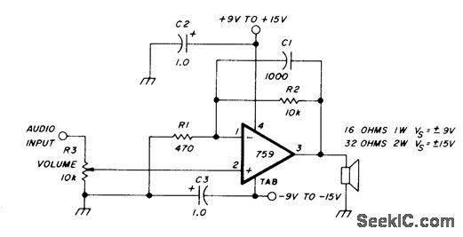 Fairdlild 759 opamp provides 1-W AF output when supply is ±9V and loudspeaker is 16 ohms,and 2 W with ±15V and 32ohm loudspeaker. Use heatsink,Gain is 20 for values shown with response rolled off at 15 kHz by C1,-W Jung,An10 Op Amp Update,Ham Radio,March 1978、p 62-69