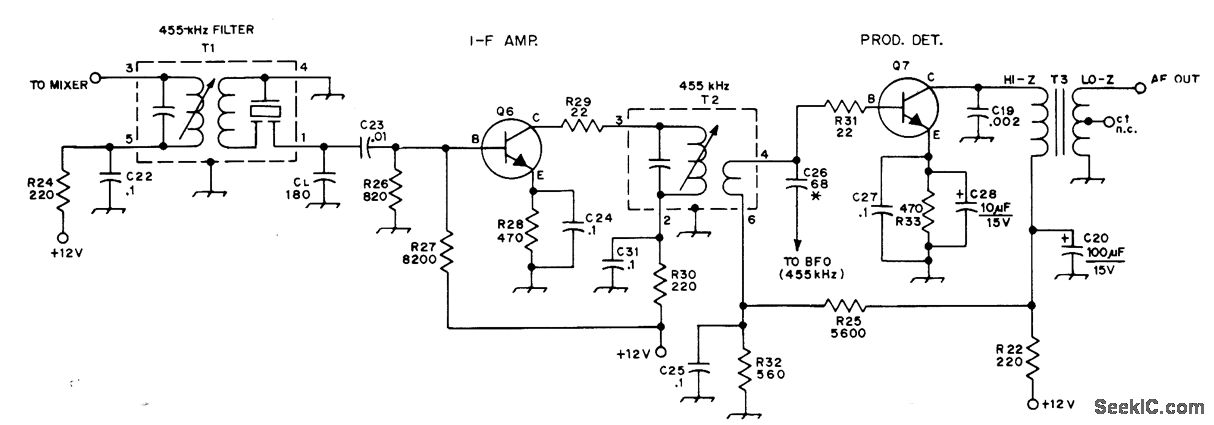 Bipolar transistor Q6 provides about 20-dB gain at 455 kHz, which is adequate for handling wide range of signal amplitudes without changing audio gain setting in receiver without AGC. Product detector produces output in audio range when its inputs are 455-kHz IF signal and BF0 signal near 455 kHz. Transistors can be 2N222, 2N3641, 2N4123, or equivalent. T1 is J. W. Miller 8814 455-kHz IF transformer/filter, T2 is miniature 455-kHz lF transformer, and T3 is miniature audiotransformer with 10K primary and 2K center-tap secondary (CT not used).-D. DeMaw and L. McCoy, Leaming to Work with Semiconductors, QST, Aug. 1974, p 26-30.