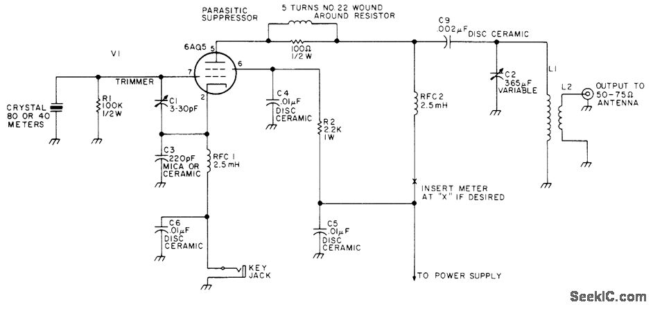 Single 6AQ5 operating from 200-V supply can cover all states and some DX with CE on 40 meters as low-power amateur radio station Antenna can be simple dipole 8 feet high L1 is 15 turns No 22 enamel on 11/4-inch plastic form, with 3 turns of insulated wire wound around cold end of L1 for L2 Article covers construction and operation and gives suitable 200-V voltage-doubling power supply circuit.-S.Dunn, ORP Fun on 40 and 80, 73 Magazine.Oct 1976, p 44-46.