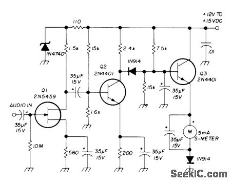 Circuit designed for 5-mA meter movement uses two-stage voltage ampilfer Q1-Q2 with emitter-follower output Q3 serving as impedance-matching stage AF input for S-9 reading is 25-30mV P-P and forfull scale is 50-60mV P-P Frequency response is 500 Hz to 10 kHz-M,A,Chapma,Solid-State S-Me-ters,Ham Radio,March 1975 p 20-23
