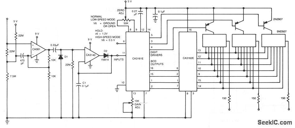 CA081 and CA3140 BiMOS op amp offer minimal loading on the circuits being measured。The wide bandwidth and high slew rate of the CA081 allow the meter to operate up to 0.5 MHz,