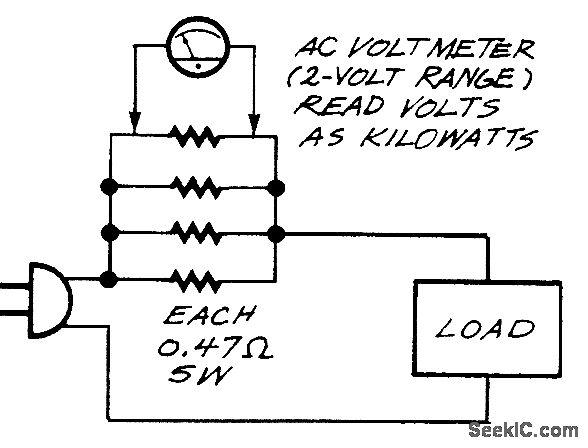 A true wattmeter is a complicated instrument. But if all the wattages that you want to measure are at the same voltage (120 Vac) and the loads are resistive (such as lights, heaters, or motors under load), you can just pass the current through at 0.12-Ω resistance (four 0.47-Ω, 5-W resistors in parallel), connect an ac voltmeter across the resistance, and read volts as kilowatts. That is, every volt across the resistance corresponds to 1000 W (equal to 8 A) drawn by the load. Remember that the voltmeter terminals are hot; use insulated pin sockets so that you won't touch the contacts accidentally. On inductive or capacitive loads, such as unloaded motors or transformers and computer power supplies, your wattmeter will read high because the current and voltage are not in phase.