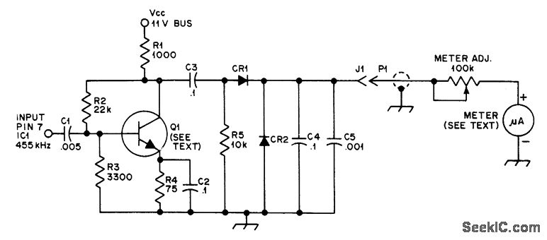 Although designed for use with Clegg FM-27B 2-meter FM receiver, circuit can be readily adapted to other receivers. Am-plifier brings low-level455-MHz IF signal up to level suitable for driving meter. For other IF, such as 10.7 or 11.7 MHz, capacitor values should be changed accordingly. Any NPN tran, sistor with beta of 30 or more at IF value can be used. Diodes can be any type. Supply should be regulated but can be 7-14 V. Output of diode detector will vary from 0 to 1 V at nominal impedance of 20K; for best result, meter with 20- to 50-μA movement can be used.-M. Stern, FM-27B S-Meter, QST, Doc. 1976, p 35.