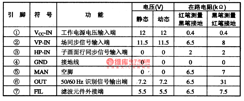 The AN5560 is composed of the sub-screen horizontal and vertical sync signal processing circuit, the 50/60HZ field frequency identification processing circuit. And this IC uses the single row 7-pin package, the pin function and data are as shwon in table 1-20.