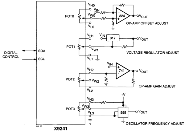 An XICOR X9241 Quad POT IC can be used to digitally adjust four analog circuits, as shown in the example schematic.
