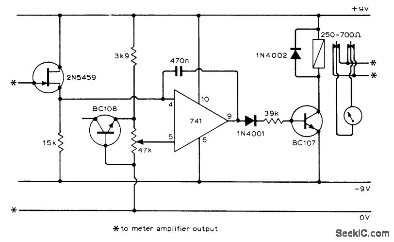 Can be added to almost any high-impedance voltmeter to give automatic reversal of polarity as required during measurements. Additional contacts on relay can be used to switch polarity indicators. FET input prevents meter shunting. Feedback is used in opamp comparator to speed switching action.-H. Wedemeyer, Auto Polarity Switching for Voltmeters, Wireless World, Oct. 1974, p 380.