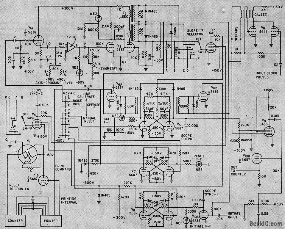Used in weak-signal detectors and in theoretical studies of noise.Samples time intervals between positive-going and negative going zero crossings, to establish un interval gate whose width equals time interval of desired weak signal. Output goes to cro for viewing of interval gate.-A. J. Rainal, Digital Measurement Axis-Crossing Intervals,Electronics, 33:23, p 88-91.