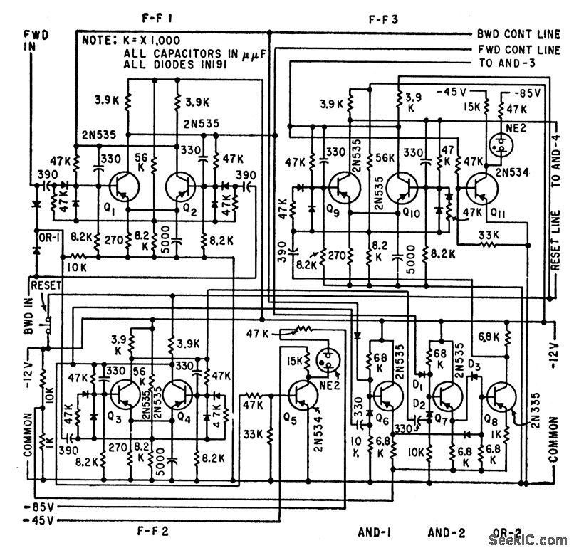 Adds or subtracts pulses under control of appropriate logic circuits. All flip-flops are identical, operating in saturation mode for maximum stability.-H.J.Weber, Binary Circuits Count Backwards or Forwards, Electronics, 32:39, p 82-83.