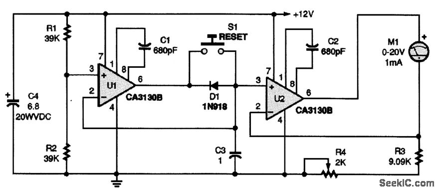 Need to discover if your battery is weak or if your starter's windings are shorted? This meter will display how low your battery voltage drops during a start. The circuit is a negative-peak reading voltmeter.