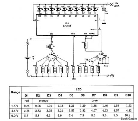 This battery tester makes use of an LM3914 bar-graph driver IC. S1 selects load on battery under test and programs the voltage range. S2 loads the battery under test. The table gives the calibration factors for the tester. LEDs D1 through D10 are used as indicators.