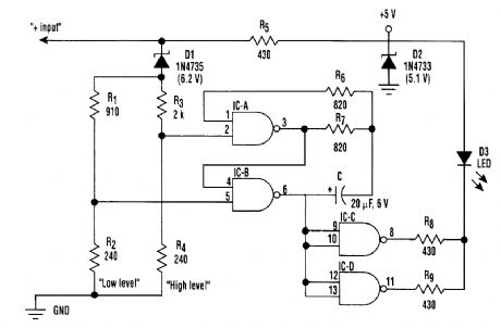 Using this circuit, three levels of voltage can be displayed-normal (11 to 15 V), high (>15 V), and low (<11 V). When the voltage is low, the LED glows steadily. In the normal range, the LED is off. When the voltage is high, the LED blinks at a 1-Hz rate. This circuit is useful for assuring proper electrical system operation.