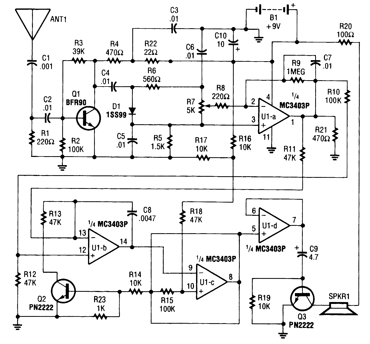 The circuit, built around a single integrated circuit (U1, an MC3403P quad op amp), three tran-sistors (Q1-Q3), and a few support components, receives its input from the antenna (ANTI). The signal is fed through a high-pass filter, formed by C1, C2, and RI, which eliminates bothersome 60-Hz pickup from any nearby power lines or line cords located in and around buildings and homes.From the high-pass filter, the signal is applied to transistor Q1 (which prov'tdes a 10-dB gain for frequencies in the 1- to 2000-MHz range) for amplification. Resistors R2, R3, and R4 form the biasing network for Q1. The amplified signal is then ac coupled, via capacitor C4 and resistor R7's (the sensi-tivity control) wiper, to the inverting input (pin 2) of U1-a. Op amp U1-a is configured as a very high gain amplifier. With no signal input from ANTI, the output of U1-a at pin 1 is near ground potential.When a signal from the antenna is applied to the base of Q1, it turns on, producing a negative-go-ing voltage at the cathode of Dl. That voltage is applied to pin 1 of UI-a, which amplifies and inverts the signal, producing a positive-going output at pin 1. Op amps UI-b and UI-c along with CS, RIO through R18, and Q2 are arranged to form a voltage-controlled oscillator fi/CO) that operates over the audio-frequency range. As the output of U1-a increases, the frequency of the VC0 increases. The VCO output, at pin 8 of U1-c, is fed to the input of U1-d, which is configured as a noninverting, unity-gain (buffer) amplifier. The output of U1-d is used to drive Q3, which, in turn, drives the output speaker.