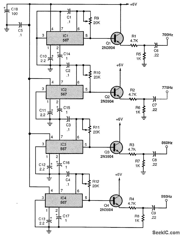 Four 567 tone-decoder ICs, IC1 to IC4, are used to generate four different audio frequencies between 700 and 950 Hz. The capacitor from pin 6 of each 567 to circuit ground, along with the resistor between pins 5 and 6, sets the operating frequency. A 2N3904 NPN transmitter is connected in an emitter-follower circuit to isolate the ICs from output loading. Each output supplies a different audio tone to four wires in a cable.