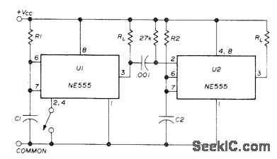 Two NE555 timers give sequential timing intervals for two separate loads.Time for U1 is set by R1 and C1, and for U2 by R2 and C2. Grounding pin 2 momentarily with switch starts timing. Once started, it cannot be retriggered. With pin 2 connected to reset input 4, both functions are obtained with one push of switch, lf reset function is not wanted, connect 4 to 8. When pin 3 of U1 goes low at end of timing interval, negative pulse generated by 0.001-μF capacitor and 27K resistor goes to pin 2 of U2 to trigger second timer. With 15-V supply, each timer can handle 200-mA load.-H. Vordenbaum, Automatic Reset Timer, Ham Radio, Oct. 1974, p 50-51.