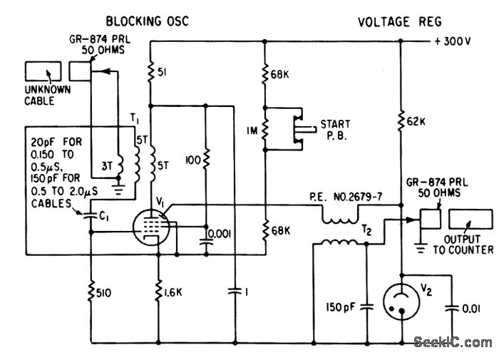 econdary-emission tube V1 (EPP-60) in blocking oscillator generates millimicrosec pulses that are fed to unknown cable through anode transformer. Pulse reflected back from open-circuited end of cable is coupled into grid through same transformer to initiate new pulse. Resulting pulse repetition rate, proportional to cable delay, is measured with 10.Mc digital counter-E. F. Laine, Getting Subnanosecond Precision in Coax Cable Delay Measurements, Electronics, 36:5, p 39-41.