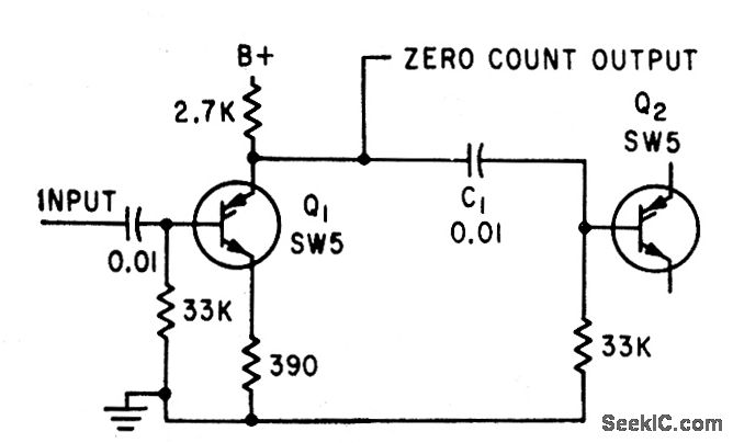 Switthing element is silicon controlled switch that approximates flip-flop, turning on when low-level positive pulse is applied to its base, and remaining on until turned off by negative pulse. Used us memory device to retain registered count until next input pulse makes bit transfer to following stage.-R.S. Reed, Rugged Arming Fuzing Timer for Atomic Artillery Missile, Electronics, 34:38, p48-51.