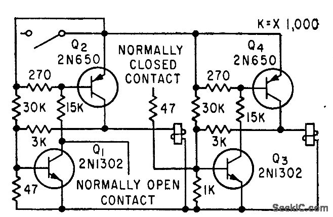 Determines whether contacts have maintained their normally open or closed conditions during shock and vibration testing. Dual circuit monitors both types of contact.-F. W. Kear, Contact Monitoring for Vibration Tests, Electronics, 33:15, p 78-79.