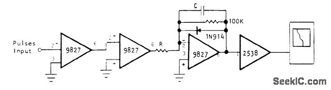 Uses three Optical Electronics 9827 opamps to amplify, square up, and integrate input pulses from event detector, to give integrated DC voltage that is function of counting rate. This voltage is compressed by 2538 DC logamp having 60-dB dynamic range for driving chart recorder. Values of R and C de-pend on counting rate, Well-regulated power supply is required because this determines am-plitude of squared pulses that drive integrator. Applications include counting photons of photomultiplier or nuclear particles of solid-state detector. Logamp compresses output of integrator to eliminate need for scale changing while giving constant accuracy over wide dy-namic range of counting rates. - Logarithmic Counting Rate Readout, Optical Electronics, Tucson, AZ, Application Tip 10106.