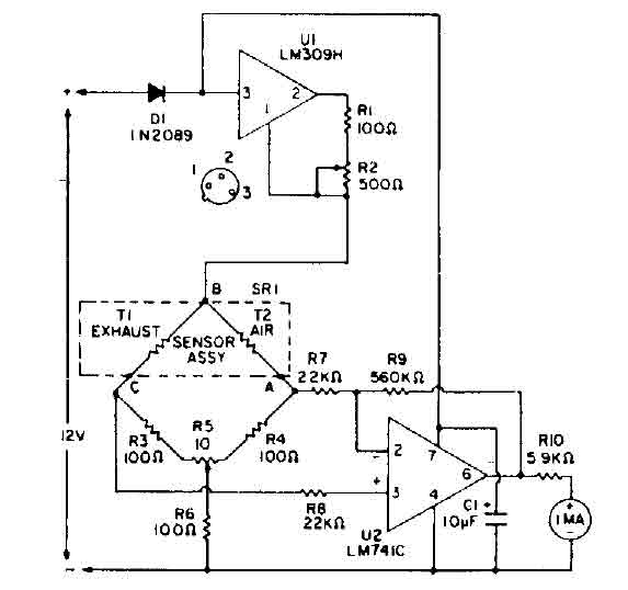 Bridge circuit contains two resistors lOO-ohm (R3 and R4), and two thermistors (Tl and T2). At room temperature, the resistance of T1 and 1'2 is about 2000 ohms. When they are each heated to 150 ° C by an RNA 10 current, the resistance value decreases to 100 ohms. So. the four elements include a bridge circuit. CO is a characteristic that conducts heat from a thermistor at a rate different from that of air. A thermistor, TI, is exposed to automobile exhaust, while the other, 1'2, is isolated in an environment of clean air. Unlike thermal conduction bridge imbalance. A voltage difference is caused between points A and C. A differential amplifier. VI, amplifies this difference and leads to the counter with a current sufficient to read the percentage of CO and air-fuel ratio. A control panel before the balance, R5, balances the bridge and calibrates the instrument. The calibration is performed when both thermistors are exposed to outside air.