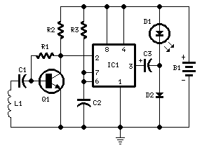 Parts:R1 100K 1/4W ResistorR2 3K9 1/4W ResistorR3 1M 1/4W ResistorC1,C2 100nF 63V Polyester CapacitorsC3 220µF 25V Electrolytic CapacitorD1 LED Red 10mm. Ultra-bright (see Notes)D2 1N5819 40V 1A Schottky-barrier Diode (see Notes)Q1 BC547 45V 100mA NPN TransistorIC1 7555 or TS555CN CMos Timer ICL1 Sensor coil (see Notes)B1 1.5V Battery (AA or AAA cell etc.)