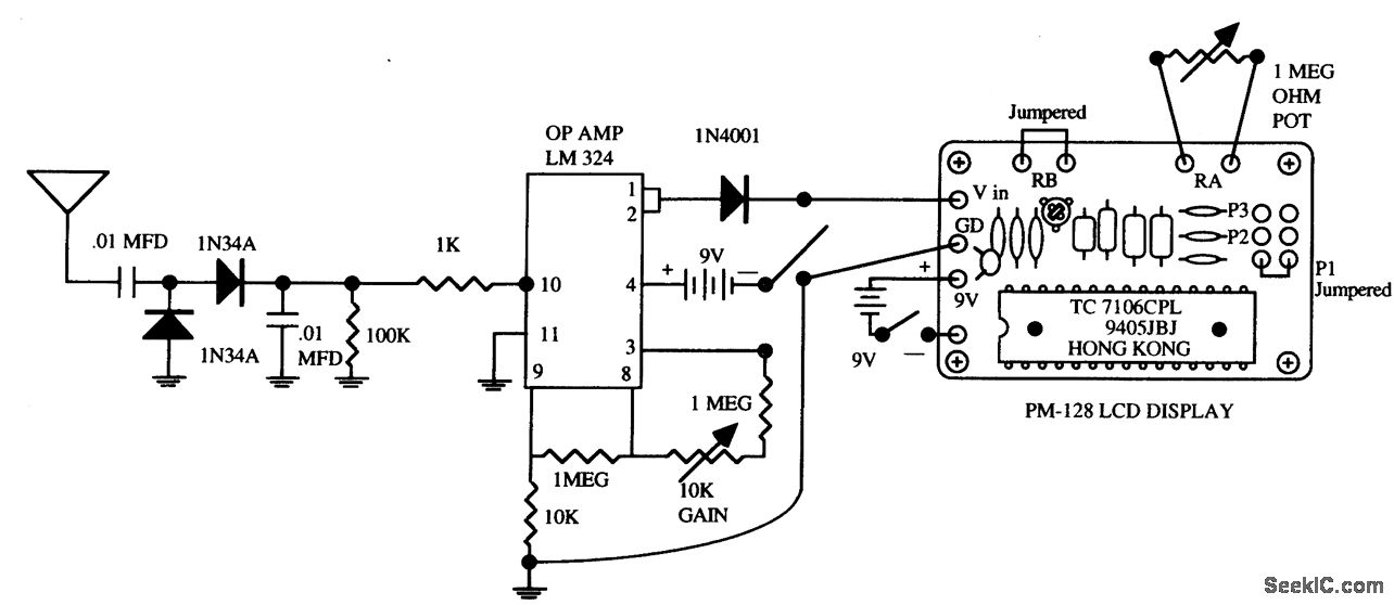 This field-strength meter uses a surplus LCD panel meter display, but any suitable unit (1 V full scale, etc.) can be used. RF is detected by a pair of 1N34 diodes and fed to an LM324 op amp acting as a dc amplifier whose gain is set via a 1-MΩ pot. The op-amp output drives the LCD panel meter.