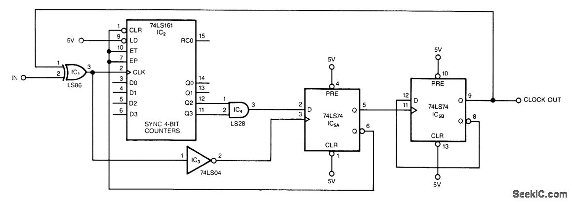 The counter and IC5A form the n+l/2 counter. Once the counter reaches the decoded counts, n, IC5A ticks off an additional 1/2 clock, which clears the counter and puts it in hold. Additionally, IC5A clocks IC5B, which changes the dock phasing through the X0R gate, IC1. The next edge of the input clocks IC5A, which reenables the counter to start counting for an additional n+l/2 cycles.