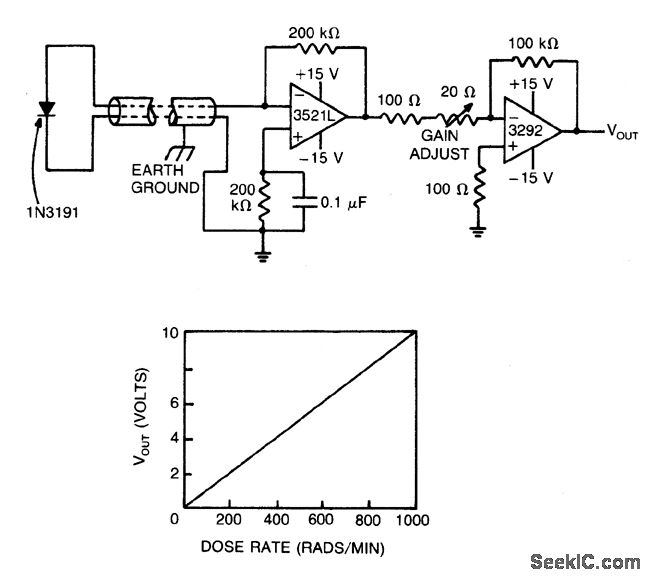 A commercial diode is the detector in this highly accurate radiation monitor. The lowdrift FET-input op amp amplifies detector current to a usable level, and the chopper-stabilized amplifier then provides additional gain while minimizing any error caused by ambient-temperature fluctuations. Gain is adjusted so that the output voltage is 1% of incident radia-tion intensity in rads per minute; therefore voltage can be displayed on 3 1/2 digit DVM for direct reading of dosage rate. Output voltage from the monitor is linearly proportional to radiation intensity at the diode.