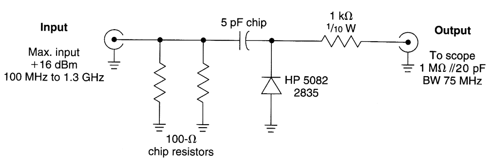 This circuit is useful as a video modulation monitor for testing low-power video transmitters. For higher power inputs, use a suitable attenuator between the detector and the source. The detector should be connected to scope with as short a cable as possible to preserve video bandwidth.