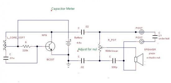 Here is the schematic of my capacitor meter I built and have used quite a bit. It will measure from zero to 0.1uf with 300pf at mid range. It is an oscillator that makes noise fed into a bridge circuit that will null out the noise when balanced. Once built, you must clip in known value capacitors and hand calibrate the dial.I built my unit into a cheap push on battery light the output can go to a small audio amp, audio input of a computer, or try a piezo speaker. The noise is rather annoying, so you may want to use a scope to view it if you must test many capacitors.