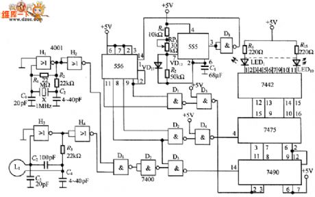 In the circuit, it uses 1MHz crystal X to generate a reference oscillation frequency, metal detector use L coil oscillator with the same nominal frequency, and NAND gate D6 will mix square wave reference signal produced by crystal oscillator and detection signal to produce a beat frequency signal circuit. 555 generates a approximately 500Hz frequency signal to drive the display 556 and NAND gate will merge the detection and display signals to add to 7490 and 7475 input ends, thereby driving the LED1 ~ LED10 emitting diodes.