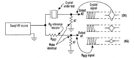 On occasion, micropro c es s ors/micro c omputers and microprocessor crystals just aren't compati-ble with each other. Many microprocessor data sheets specify maximum values for a crystal's equiv-alent series resistance (RS) that aren't met by some crystals advertised for microprocessor/ microcomputer use. As a result, a crystal with an RSvalue greater than the maximum specified for the chip might cause problems, such as a balky or even inoperative clock oscillator.To tackle this problem, a suspected crystal can be given a quick check forRS with a simple test setup that consists of a sweep generator, oscilloscope, and three resistors (see the figure). When the frequency source is brought to the crystal's frequency, output 2 will maximize. If it exceeds the am-plitude of output 1, the crystal's RS value will be less than the RS reference resistor's value. If it doesn't exceed output 1's amplitude, the crystal's RS value is too large.