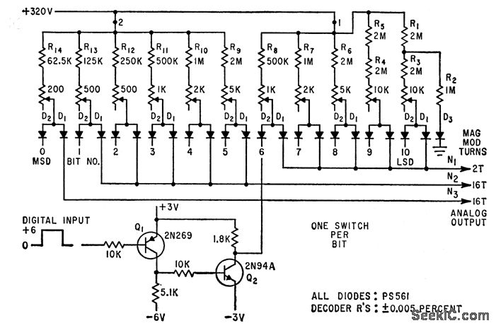 Well-regulated transistor power supply and binary-weighted network of precision wire-wound resistors give high-precision conversion of 11-bit digital value to current analog. Output goes to magnetic modulator. Regulated 320-v supply(not shown) uses silicon junction diodes in full-wave bridge, with silicon zener diode as reference.-N. Aron,Precise Converter Takes Current Analog of Digital Voltage Pulses, Electronics,35:32, p 68-71.