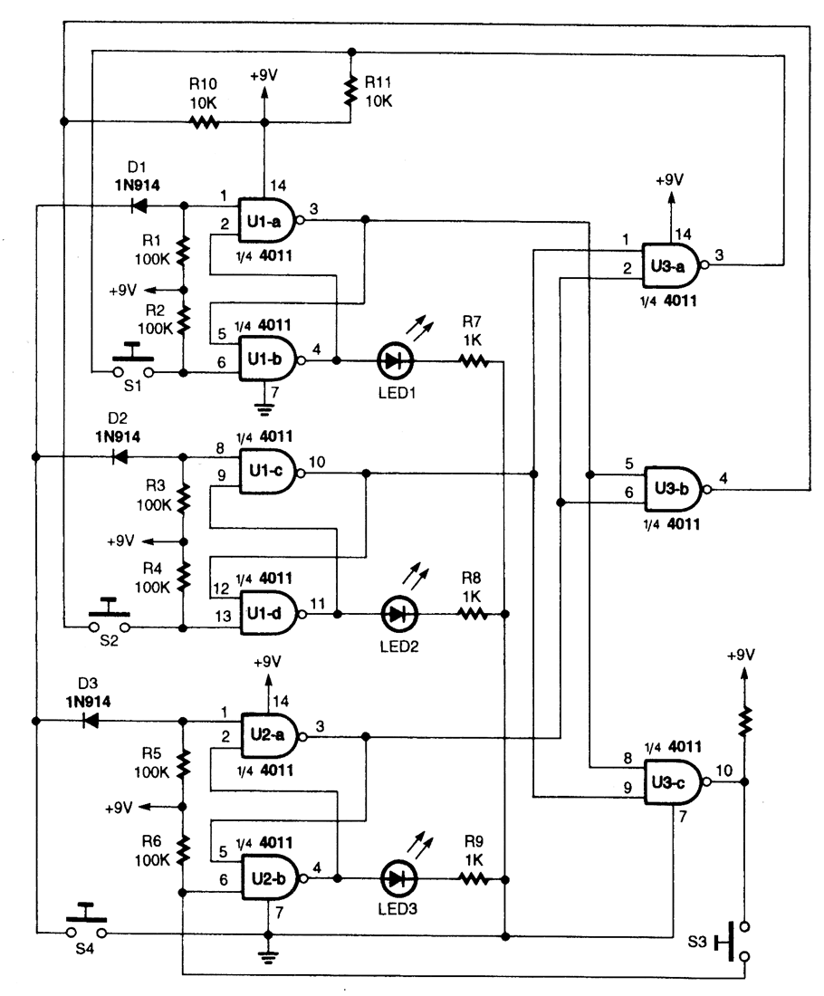 Three interlocked flip-flops enable the detection of the first input. S1, S2, and S3 are inputs.Analog switches controlled by logic gates, or other logic circuitry could be sub-statement for S1, S2, and S3.