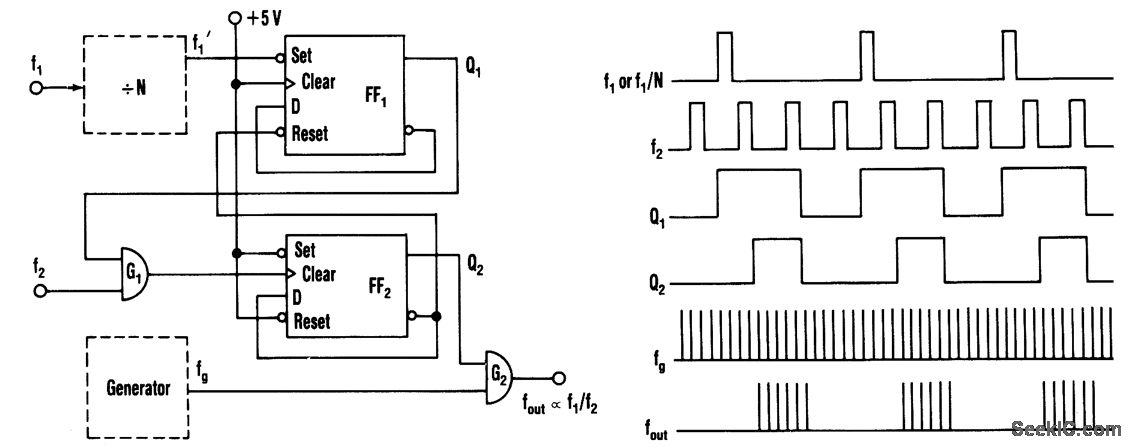 This circuit produces an output frequency that is linearly proportionj to the ratio oftwo input frequen-cies fl/f2.Each pulse of the bias f1(or f)will open G1 for a period T=1/f2 so that fg/f2, pulses pass to the output.